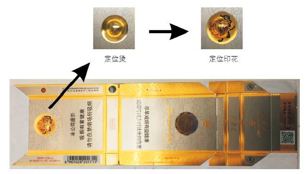 其次,該煙包運用了先定位燙再膠印的加工工藝,根據(jù)工藝設(shè)計特點,定位燙的精度偏差應(yīng)控制在0.30mm以內(nèi),其實這個精度要求對于定位燙來說已經(jīng)很低了,之所以能允許這么大的寬容度,全有賴于后續(xù)定位印花工藝對定位燙偏差量的壓邊修飾與遮蓋。但由于定位印花直接印在定位燙圖案上,因此在定位燙實施過程中,需要重點控制電化鋁的附著力,同時也要關(guān)注燙印壓力的控制,這直接關(guān)系到定位燙的鎖邊邊緣是否燙印良好。所以,對于定位燙工藝而言,控制重點并非燙印規(guī)線,而是電化鋁的附著力和燙印壓力。