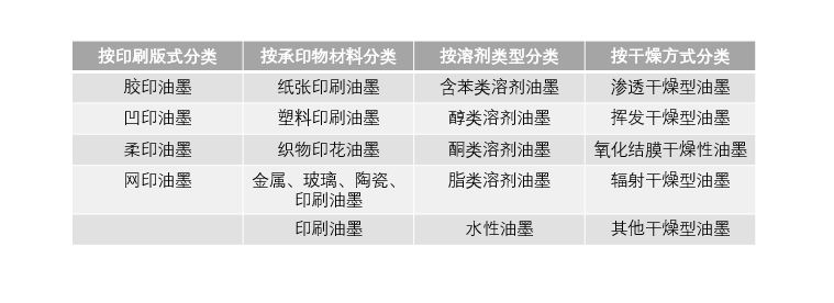 油墨的種類有很多,不同類型的油墨組成差異較大,性能也各不相同。按照印刷版式、承印物材料、溶劑和干燥方式的不同,油墨主要可以分為以下幾類: