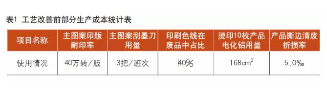 由于該產(chǎn)品印刷顏色多、生產(chǎn)工序多、紙張幅面大、套印精度要求高、油墨流平性控制難、燙印圖案方向固定、紙張表面光滑等原因,造成產(chǎn)品合格率低,印版耐印率低,電化鋁利用率低,刮墨刀更換頻繁,撕邊清廢折損率高等問題,生產(chǎn)成本居高不下。現(xiàn)把主要工序工藝改善前的部分生產(chǎn)成本情況進(jìn)行統(tǒng)計(jì),如表1所示。