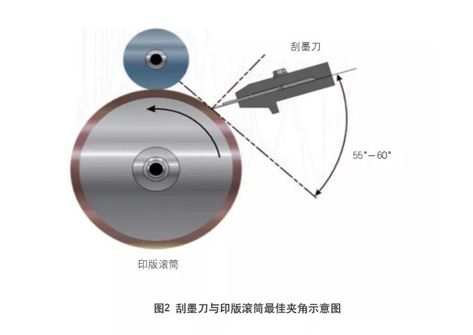 通過多次試驗(yàn)驗(yàn)證,確認(rèn)刮墨刀與印版滾筒之間的夾角控制在55o~60o之間,刮墨刀與印版滾筒之間的壓力控制在1.5±0.1bar時(shí)效果較佳,如圖2所示。刮墨刀刮墨干凈,無明顯磨損,產(chǎn)品表面無色線。