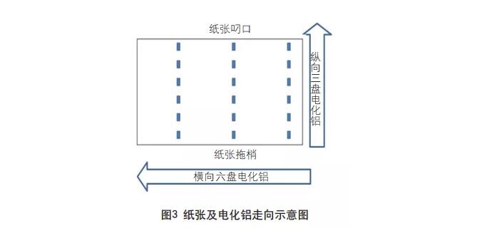 在燙印工序,改善前的電化鋁走向?yàn)榭v向,如圖3所示。因?yàn)殡娀X上有“黃金葉”葉子形狀的圖案,葉子燙印圖案的方向必須與印張一致,根據(jù)印刷圖案3×6的排版方式,及電化鋁中“黃金葉”葉子的原有排列方向,電化鋁的走向需為縱向,走箔方式為勻步加跳步,使用3盤3cm寬的電化鋁。