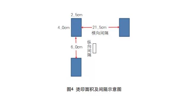 但是通過觀察測(cè)量燙印圖案面積和間隔,如圖4所示,經(jīng)過計(jì)算對(duì)比電化鋁跳步距離,發(fā)現(xiàn)電化鋁走向?yàn)榭v向時(shí)浪費(fèi)較大,每燙印10枚產(chǎn)品平均使用電化鋁的面積為56×3=168cm2,并且電化鋁更換頻繁,停機(jī)次數(shù)較多,每盤1200m長的電化鋁只能燙印4000張印張;而電化鋁走向改為橫向時(shí),走箔方式為勻步,使用6盤5cm寬的電化鋁,每燙印10枚產(chǎn)品平均使用電化鋁的面積為18×5=90cm2,每盤1200m長的電化鋁能夠燙印20000張印張,不但電化鋁的使用面積減少,停機(jī)次數(shù)也大為減少,生產(chǎn)效率明顯提高,產(chǎn)品質(zhì)量也更加穩(wěn)定。