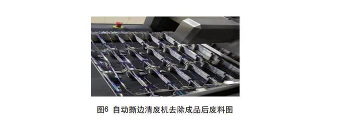 在撕邊工序,改善前的通常情況是印刷紙張模切完以后由人工進(jìn)行撕邊清廢。但是該產(chǎn)品表面印刷有UV光油,紙張表面較為光滑,不易被抓牢,且由于圖案工藝設(shè)計(jì)的需要,在每兩個(gè)盒片的縱向之間排列有3mm寬的間隔條,在進(jìn)行人工撕邊清廢時(shí)紙張容易脫手,造成產(chǎn)品折損率較高,浪費(fèi)較大,效率較低,每人每小時(shí)只能完成2000張印張的撕邊清廢量,為此我們進(jìn)行了多次論證分析,決定利用多頭自動(dòng)撕邊清廢機(jī)(如圖6所示),由人工撕邊清廢改為由機(jī)器撕邊清廢。