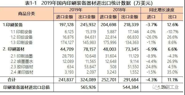 2019年是國內(nèi)外經(jīng)濟(jì)環(huán)境發(fā)生深刻變化的一年。世界主要大國經(jīng)濟(jì)增長動(dòng)能不足、逆全球化貿(mào)易保護(hù)勢頭加強(qiáng)、地緣政治矛盾激化;國內(nèi)產(chǎn)能和流動(dòng)性過剩、有效需求不足、宏觀經(jīng)濟(jì)運(yùn)行下行壓力加大,對企業(yè)的生產(chǎn)經(jīng)營、市場預(yù)期帶來很多不利影響。面對國內(nèi)外如此復(fù)雜局面,國內(nèi)印刷裝備、器材進(jìn)出口貿(mào)易能夠保持增長、貿(mào)易順差繼續(xù)擴(kuò)大,貿(mào)易商品結(jié)構(gòu)不斷優(yōu)化,展現(xiàn)出國內(nèi)印刷設(shè)備、器材制造業(yè)強(qiáng)大的發(fā)展韌性。2019年國內(nèi)印刷裝備、器材進(jìn)出口貿(mào)易概述2019年國內(nèi)印刷裝、器材進(jìn)出口貿(mào)易總值達(dá)到56.59億美元(同比增長4.0%),其中,進(jìn)口24.18億美元,同比下降4.3%;出口32.41億美元,同比增長11.1%。2019年國內(nèi)印刷裝備、器材進(jìn)出口貿(mào)易順差8.23億美元,同比增長111.0%。2019年國內(nèi)印刷裝備、器材進(jìn)口24.18億美元。其中,2019年國內(nèi)印刷裝備進(jìn)口19.71億美元,相比下降4.3%;國內(nèi)印刷器材進(jìn)口4.47億美元,同比下降6.9%。