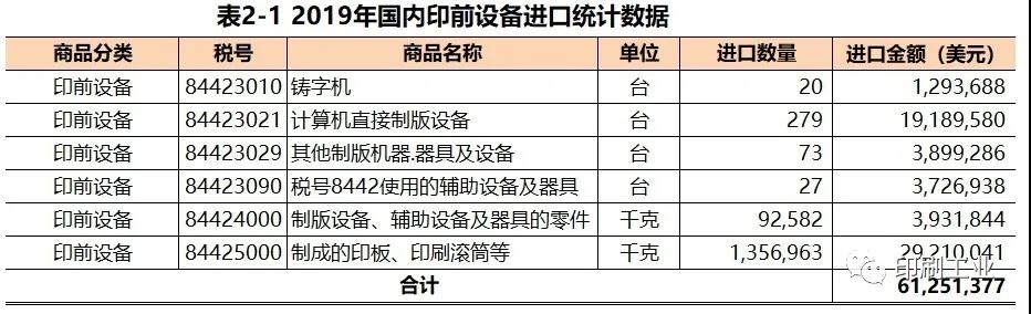 2019年國內(nèi)印刷裝備、器材進(jìn)口商品構(gòu)成2019年國內(nèi)印刷裝備、器材進(jìn)口總值24.18億美元。其中,印刷裝備進(jìn)口19.71億美元、印刷器材進(jìn)口4.47億美元。印刷裝備和印刷器材進(jìn)口占國內(nèi)印刷裝備、器材進(jìn)口總值的百分比分別為82%、18%。作為國內(nèi)印刷裝備、器材進(jìn)口貿(mào)易是主要組成部分,2019年印刷裝備進(jìn)口值中,印前設(shè)備0.61億美元、印刷設(shè)備18.41億美元、印后設(shè)備1.69億美元。三者占印刷裝備進(jìn)口值的百分比,分別為3%、88%和9%。1.印前設(shè)備進(jìn)口2019年國內(nèi)印前設(shè)備進(jìn)口6125萬美元(參見 表2-1)。其中,鑄字機(jī)進(jìn)口129萬美元(20臺)、計(jì)算機(jī)直接制版機(jī)進(jìn)口1919萬美元(279臺)、其他制版機(jī)390萬美元(73臺)、制版輔助設(shè)備372萬美元(27臺)、制版設(shè)備及輔助設(shè)備零件393萬美元、制成印版、滾筒及其他印刷部件進(jìn)口2921萬美元。計(jì)算機(jī)制版機(jī)和制成印版、滾筒及其他印刷部件是印前設(shè)備里進(jìn)口值大的兩項(xiàng)、占印前設(shè)備全年進(jìn)口值的79%。與2018年相比,2019年計(jì)算機(jī)直接制版機(jī)進(jìn)口數(shù)量增加了3%(由272臺提高到279臺),其平均進(jìn)口單價(jià)下降了11%(由7.75萬美元減低到6.88萬美元)。計(jì)算機(jī)直接制版機(jī)的主要進(jìn)口來源國是德國、日本、加拿大、比利時(shí)。