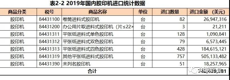 2.印刷設(shè)備進(jìn)口2019年國內(nèi)印刷設(shè)備進(jìn)口17.41億美元。其中,膠印機(jī)進(jìn)口7.43億美元、數(shù)字印刷機(jī)進(jìn)口3.00億美元、其他常規(guī)印刷機(jī)(凹印機(jī)、凸印機(jī)、絲印機(jī)、柔印機(jī)、未列明印刷機(jī))進(jìn)口1.58億美元、輔機(jī)零件進(jìn)口5.41億美元。膠印機(jī)、數(shù)字印刷機(jī)、其他常規(guī)印刷機(jī)、輔機(jī)零件進(jìn)口占印刷設(shè)備進(jìn)口值的百分比分別為43%、17%、9%、31%。膠印機(jī)進(jìn)口2019年國內(nèi)膠印機(jī)進(jìn)口7.43億美元(1528臺)。其中,卷筒膠印機(jī)進(jìn)口2695萬美元(82臺)、平張紙單色膠印機(jī)進(jìn)口109萬美元(128臺)、平張紙雙色膠印機(jī)進(jìn)口657萬美元(79臺)、平張四色膠印機(jī)1.84億美元(428臺)、其他平張(四色以上)膠印機(jī)進(jìn)口5.05億美元(757臺)。進(jìn)口值大的平張四色膠印機(jī)和其他平張(四色以上)膠印機(jī)進(jìn)口占膠印機(jī)進(jìn)口總值的93%(參見 表2-2)。