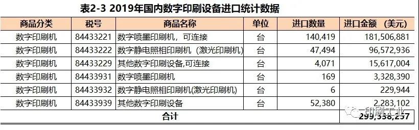 2019年,國內(nèi)進(jìn)口的四色及其他平張膠印機(jī)的主要來自德國和日本。數(shù)字印刷設(shè)備進(jìn)口2019年國內(nèi)各類數(shù)字印刷設(shè)備進(jìn)口接近3.00億美元、數(shù)量達(dá)24.45萬臺(參見 表2-3)。這些設(shè)備歸類在6個(gè)稅目下,除了業(yè)界通稱的數(shù)碼印刷機(jī)、噴墨印刷機(jī)外,還包括數(shù)字標(biāo)簽印刷機(jī)、大幅面噴墨印刷機(jī)等專業(yè)數(shù)字印刷設(shè)備。