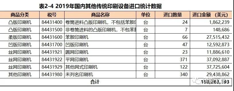 2019年國內(nèi)進(jìn)口各類噴墨印刷機(jī)14萬臺(與上年相比減少了12%)、平均進(jìn)口單價(jià)1315美元(與上年相比減少了13%);進(jìn)口各類激光數(shù)碼印刷機(jī)4.75萬臺(與上年相比增加了7%)、平均進(jìn)口單價(jià)2038美元(與上年相比增長了16%)。2019年國內(nèi)共進(jìn)口單價(jià)超過10萬美元的噴墨印刷設(shè)備190臺,其主要進(jìn)口來源國為,瑞士、奧地利、以色列、意大利、西班牙、法國。需要說明的是,海關(guān)的6個(gè)相關(guān)稅目把數(shù)字印刷設(shè)備又分成了兩類,既與網(wǎng)絡(luò)和數(shù)據(jù)庫相關(guān)聯(lián)的設(shè)備和獨(dú)立使用的數(shù)字印刷設(shè)備。其目的是將用于不同領(lǐng)域的數(shù)字印刷設(shè)備區(qū)別開來。但在實(shí)踐中并不理想。這不僅是因?yàn)檫M(jìn)口歸類的人為因素的影響,也是由于數(shù)字印刷設(shè)備類型很多(數(shù)碼印刷機(jī)、數(shù)字標(biāo)簽印刷機(jī)、寬幅噴繪機(jī)、數(shù)字繪圖機(jī)等)。故當(dāng)印刷人看到數(shù)字印刷機(jī)的進(jìn)出口數(shù)據(jù)時(shí),常常感到困惑。對于想了解數(shù)字印刷設(shè)備在傳統(tǒng)印刷領(lǐng)域的增長信息的人士,還需要借鑒其他渠道的信息得出自己的判斷;但是對于印刷設(shè)備制造企業(yè)或?qū)﹃P(guān)心數(shù)字印刷應(yīng)用的人士而言,海關(guān)的數(shù)字印刷機(jī)進(jìn)口數(shù)據(jù)告訴了我們一個(gè)事實(shí),即目前國內(nèi)數(shù)字印刷機(jī)的主要應(yīng)用領(lǐng)域并不在傳統(tǒng)印刷行業(yè)。數(shù)字印刷技術(shù)、特別是噴墨印刷技術(shù)的發(fā)展遠(yuǎn)遠(yuǎn)突破了傳統(tǒng)意義上的“印刷機(jī)”,它的應(yīng)用領(lǐng)域也遠(yuǎn)遠(yuǎn)超出了我們所熟悉的“印刷行業(yè)”。其他常規(guī)印刷機(jī)進(jìn)口2019年國內(nèi)其他常規(guī)印刷機(jī)進(jìn)口1.58億美元(參見表2-4)、數(shù)量達(dá)1000臺。其中,凸印機(jī)進(jìn)口201萬美元(31臺)、柔印機(jī)進(jìn)口2751萬美元(66臺)、凹印機(jī)進(jìn)口1259萬美元(47臺)、圓網(wǎng)印刷機(jī)進(jìn)口1189萬美元(23臺)、平網(wǎng)印刷機(jī)進(jìn)口3709萬美元(371臺)、其他網(wǎng)式印刷機(jī)進(jìn)口3773萬美元(122臺)、未列明印刷機(jī)進(jìn)口2944萬美元(340臺)。按設(shè)備進(jìn)口金額計(jì),占其他常規(guī)印刷機(jī)進(jìn)口值前三位的是其他網(wǎng)式印刷機(jī)(24%)、平網(wǎng)印刷機(jī)(23%)和未列明印刷機(jī)(19%)。