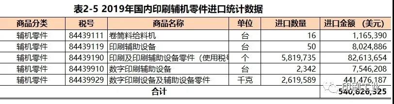 與2018年相比,2019年國內(nèi)柔版印刷機(jī)進(jìn)口數(shù)量增長了7%(由上年的62臺增長到66臺)、其平均進(jìn)口單價(jià)下降了28%(由上年的57.93萬美元下降到41.69萬美元);凹印機(jī)進(jìn)口數(shù)量下降了18%(由上年的57臺減少到47臺)、其平均進(jìn)口單價(jià)下降了19%(由上年的33.24萬美元下降到26.79萬美元);圓網(wǎng)印刷機(jī)進(jìn)口數(shù)量增長了1.5倍(由上年的9臺提高到23臺)、平均進(jìn)口單價(jià)增長了15%(由上年的45.11萬美元提高到51.68萬美元);平網(wǎng)印刷機(jī)進(jìn)口數(shù)量下降了10%(由上年的414臺增加到371臺)、平均進(jìn)口單價(jià)下降了21%(由上年的12.64萬美元下降到10.00萬美元)。按進(jìn)口單價(jià)超過100萬美元作為標(biāo)準(zhǔn),2019年國內(nèi)共進(jìn)口柔版印刷機(jī)13臺(進(jìn)口來源國有西班牙、捷克、德國、美國)、凹印機(jī)8臺(進(jìn)口來源國為意大利和日本)、圓網(wǎng)印刷機(jī)4臺(進(jìn)口來源國德國)。輔機(jī)零件進(jìn)口2019年進(jìn)口的輔機(jī)零件5.41億美元(參見 表2-5)。其中,涉及常規(guī)印刷機(jī)使用的部分占輔機(jī)零件進(jìn)口值的17%,數(shù)字印刷機(jī)使用的輔機(jī)零件占輔機(jī)零件進(jìn)口值的83%。本期,常規(guī)印刷機(jī)及輔機(jī)用零件進(jìn)口值8261萬美元(比上年增長了13%)、數(shù)字印刷設(shè)備及輔機(jī)用零件進(jìn)口4.41億美元(比上年下降了3%)。2019年國內(nèi)常規(guī)印刷機(jī)及輔機(jī)用零件進(jìn)口主要來源國是德國、日本、意大利、瑞士和荷蘭;數(shù)字印刷設(shè)備及輔機(jī)用零件進(jìn)口主要來源國日本、美國、新加坡、馬來西亞。