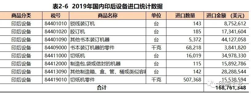 3.印后設備進口2019年國內印后設備進口1.68億美元(參見 表2-6)。其中,涉及書刊、本冊裝訂的設備及零件進口7406萬美元占印后設備進口總值的44%,而印后包裝類設備(制袋、制盒設備)進口4418萬美元占印后設備進口總值的26%、切紙機及零件進口5052萬美元占印后設備進口的30%。