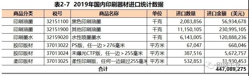 與上年相比,2019年國內鎖線裝訂機進口數量下降了25%(由上年的190臺減少到143臺)、其平均進口單價提高了42%(由上年的4.31萬美元提高到6.12萬美元);膠訂機進口數量下降了43%(由上年的322臺減少到185臺)、對應的平均進口單價提高了16%(由上年的8.10萬美元上漲到9.37萬美元);制袋類設備進口數量由上年的17臺增長了115臺、對應的平均進口單價由上年的29.43萬美元下降到13.82萬美元(下降幅度達53%);制盒類設備進口數量減少了24%(由上年的186臺下降到142臺)、平均進口單價降低6%(由上年的21.23萬美元下降到19.92萬美元)。2019年國內從德國和意大利進口鎖線機46臺(平均單價超過10萬美元)、從瑞士、德國、意大利進口膠訂機51臺(平均單價超過10萬美元)、從日本、德國進口制袋類設備10臺(平均單價超過100萬美元)。4.印刷器材進口2019年國內印刷器材進口值4.47億美元(參見 表2-7)。其中,涉及印刷油墨、墨水類商品進口4.08億美元占同期印刷器材進口值的92%、印刷版材類商品進口0.38億美元占同期印刷器材進口值的8%。印刷器材進口商品中,其他印刷油墨(即彩色及特種油墨)名列印刷器材進口值第一位,其進口值占印刷器材進口總值52%。