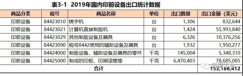 表2-8提供了2019年國內進口前十位的印刷設備、印刷器材商品目錄及進口值。這些商品的進口值占同期印刷裝備、器材進口總值的80%。與2018年相比,2019年這10種商品中的7種商品進口值出現下降,直接拉低了國內印刷裝備、器材進口的整體增長態(tài)勢。究其導致進口下降的原因有二:(1)國內印刷市場需求下降由于國內宏觀經濟增長速度趨緩,印刷行業(yè)低速運營的狀態(tài)。加上環(huán)保治理的壓力,印刷行業(yè)兩極分化嚴重。而互聯網對零散訂單的聚集作用,進一步加劇了企業(yè)間的分化。2019年國內規(guī)模以上印刷企業(yè)營業(yè)收入同比增長速度僅有1.6%,就是上述情況的綜合反映。考慮到當年的價格變動因素,國內印刷行業(yè)的整體規(guī)模實際處于零增長或萎縮的局面。在如此困難的經營環(huán)境下,進口設備的需求主要來自大型包裝印刷企業(yè)和依靠互聯網聚合市場存量的商業(yè)印刷企業(yè)。前者購置設備目的以提升效率為主、擴大產能為輔,而后者雖以擴大產能購買進口設備,但由于新的市場需求不足,現有存量市場的整合空間有限,影響這些商業(yè)印刷企業(yè)的經營模式的快速復制,其持續(xù)拉動進口設備的增長的能力不足。(2)“世界工廠”產能轉移2019年數字印刷設備零配件進口4.41億美元,占國內印刷裝備、器材進口總值的18%。其中,大部分零配件是以“來料加工”的貿易方式進口,在國內組裝成品或完成配套、然后再出口的。近兩年,由于國內勞動力成本快速提升和中美貿易摩擦的影響,國內相關行業(yè)的產能逐漸向外轉移,進而導致國內數字印刷設備及其零配件的進口規(guī)模出現萎縮。另外,國內進口印刷油墨主要用于出口商品包裝和國內高端印刷品的印刷,其進口數量受國內市場和產能轉移的共同影響出現下降。2019年國內印刷裝備、器材出口商品構成2019年國內印刷裝備、器材出口總值32.41億美元。其中,印刷裝備出口24.59億美元(占國內印刷裝備、器材出口總值的76%)、印刷器材出口7.81億美元(占國內印刷裝備、器材出口總值的24%)。印刷裝備出口值中,印前設備1.53億美元、印刷設備14.60億美元、印后設備8.46億美元。三者占印刷裝備進口值的百分比分別為6%、59%和25%。1.印前設備出口2019年國內印前設備出口1.53億美元(參見 表3-1)。其中,鑄字機出口83萬美元(1306臺)、計算機直接制版機出口5599萬美元(1424臺)、其他制版機出口1038萬美元(6326臺)、制版輔助設備195萬美元(1932臺)、制版設備及輔助設備零件535萬美元、制成印版、滾筒及其他印刷部件進口7868萬美元。計算機制版機和制成印版、滾筒及其他印刷部件占印前設備全年出口值的88%。