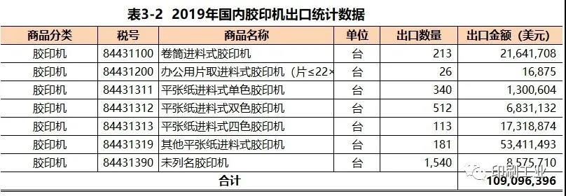 與上年相比,20膠印機對比2019年國內膠印機進口1528臺(7.43億美元)、出口2925臺(1.09億美元):