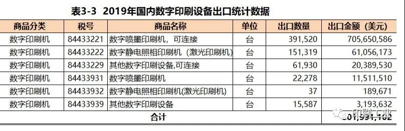 與上年相比,2019年國內卷筒膠印機的出口數量下降了21%(由上年的274臺減少到213臺),其平均出口單價略有提高(增幅1.5%),由10.01萬美元提高到10.10萬美元;辦公小膠印機出口數量79%(由上年的126臺減少到26臺)、對應平均出口單價提高了近一倍(由上年的332美元提高到649美元);平張單色膠印機出口數量增長51%(由上年的225臺增加到340臺)、其平均出口單價下降了45%(由上年的6887美元下降到3825美元);平張雙色膠印機出口數量增長了109%(由上年的245臺增加到512臺)、其出口平均單價下降了44%(由上年的2.36萬美元下降到1.33萬美元);平張四色膠印機進口的情況有所不同。2019年平張四色膠印機出口數量下降了94%(在上年1943臺減少到113臺),其平均出口翻了10多倍(由上年的1.10萬美元提高到15.32萬美元);其他平張(四色以上)膠印機出口情況與四色膠印機類似。2019年其他平張(四色以上)膠印機出口數量下降了66%(由上年的536臺減少到181臺),而平均出口單價由8.19萬美元提高到29.51萬美元(漲幅達260%)。2019年國內膠印機出口的主要國家有,越南、印度、菲律賓、泰國、土耳其、孟加拉國。數字印刷設備出口2019年國內出口各類數字印刷設備8.02億美元、數量達64.27萬臺(參見 表3-3)。其中,國內出口各類噴墨印刷機41.38萬臺(與上年相比增長了18%)、、平均出口單價1733美元(與上年相比減少了11%);出口各類激光數碼印刷機15.14萬臺(與上年相比增長了184%)、平均出口單價405美元(與上年相比下降了4%)。