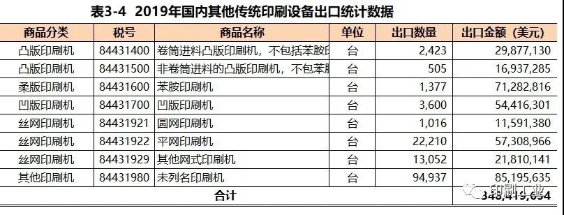 如前面進口相關部分的解釋,由于海關稅則里有相關辦公數字打印機的單獨分類,故此處數字印刷設備是一個除辦公打印設備以外的更廣的數字印刷設備概念。其中,僅可連接的數字噴墨印刷機一項,就占數字印刷設備出口總值的88%。由于缺乏詳細資料,上述噴墨印刷機的用途有待澄清。但從其出口平均單價不超過2000美元來判斷,該類噴墨印刷機應該不屬于印刷行業(yè)使用的生產設備。2019年國內噴墨印刷機出口多(按出口值計)的國家有,印度、日本、韓國、越南。其他常規(guī)印刷機出口2019年國內其他常規(guī)印刷機出口3.48億美元(13.34萬臺)。其中,凸印機出口4681萬美元(2928臺)、柔印機出口7128萬美元(1377臺)、凹印機5442萬美元(3600臺)、圓網印刷機1159萬美元(1016臺)、平網印刷機5731萬美元(22210臺)、其他網印機2181萬美元(13052臺)。位于其他常規(guī)印刷機出口值前三位的是未列明印刷機、柔版印刷機和平網印刷機(參見 表3-4)。