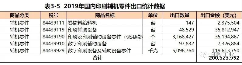 - 輔機零件對比2019年國內進口印刷輔機零件進口5.41億美元、出口2.00億美元: