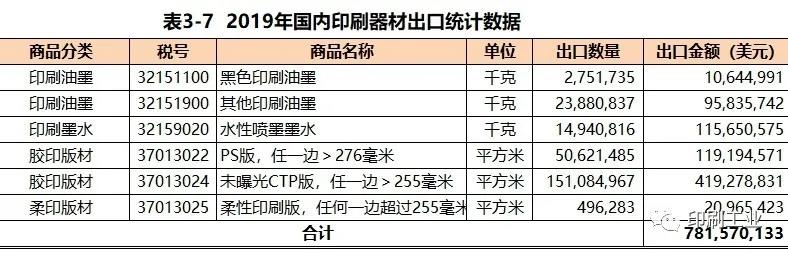 與上年相比,2019年國內鎖線裝訂機出口數量增長了14%(由上年的1.47萬臺提高到1.68萬臺)、其平均出口單價提高了74%(由上年的60美元提高到104美元);膠訂機出口數量增長了25%(由上年的1.17萬臺提高到1.46萬臺)、平均出口單價下降了19%(由上年的625美元減少到509美元);制袋類設備出口數量下降了47%(由上年的6390臺下降到3414臺)、對應的平均出口單價由上年的9328美元上漲到2.89萬美元(上漲幅度達210%);制盒類設備出口數量增長了101%(由上年的1.73萬臺增加到2.59萬臺)、平均出口單價下降了42%(由上年的1.72萬美元下降到1.00萬美元)。2019年國內切紙機出口前五位的國家有,越南、印度、馬來西亞、印度尼西亞、泰國;同期,制盒類設備出口前五位的國家有,印度、越南、泰國、馬來西亞、印度尼西亞。4.印刷器材出口2019年印刷器材出口總值7.81億美元(參見 表3-7)。其中,涉及印刷油墨、墨水類商品出口2.22億美元占同期印刷器材出口值的29%、印刷版材類商品出口5.59億美元占同期印刷器材出口值的71%。印刷器材出口商品中,CTP膠印版材名列印刷器材出口值第一位,其出口值占印刷器材出口總值54%。與2018年相比,2019年國內黑色印刷油墨出口數量由上年的2680噸提高為2750噸(下降幅度3%)、其平均出口單價(4美元/千克)保持不變;其他印刷油墨出口數量2.39萬噸與上年持平、平均出口單價由上年的4.22美元/千克下降到4.01美元/千克(降幅5%);噴墨墨水出口數量由上年的1.13萬噸提高為1.49萬噸(增長幅度32%)、其平均出口單價由上年的8.08美元/千克下降到7.74(降幅4%);膠印PS版出口數量由上年的5146萬平方米下降為5042萬平方米(增長幅度降幅2%)、其平均出口單價由2.46美元/平方米下降到2.35美元/平方米(降幅4%);膠印CTP版出口數量由上年的1.28億平方米增加到1.51億平方米(增幅18%)、其平均出口單價由上年的3.04美元/平方米下降到2.78美元/平方米(降幅9%);柔印版材出口數量由上年的33萬平方米提高到50萬平方米(漲幅50%)、其平均出口單價由上年的47美元/平方米下降到42美元/平方米。2019年國內膠印版材出口前五位的國家有,韓國、印度、土耳其、越南、印度尼西亞。