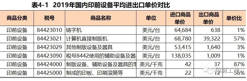印刷輔機設備進口50臺(平均單價16.05萬美元)、出口4.85萬臺(平均單價738美元),進出口單價比0.5%;