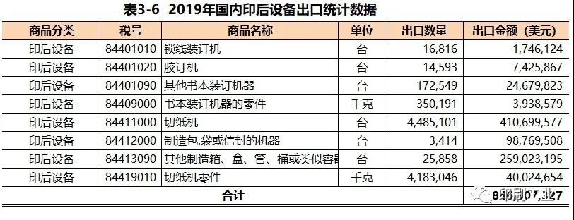 19年常規(guī)印刷機及輔機用零件出口值3519萬美元(比上年增長14.3%)、數字印刷設備及輔機用零件出口1.20億美元(比上年增長1.6%)。2019年國內常規(guī)印刷輔機和相關零件出口(按出口值計)前五位的國家有,日本、馬來西亞、越南、印度、泰國;數字印刷設備及輔機用零件出口前五位的國家有,日本、以色列、韓國、新加坡、泰國。3. 印后設備出口2019年印后設備出口8.46億美元(參見 表3-6)。其中,涉及書刊、本冊裝訂的設備及零件出口3779萬美元占印后設備出口總值的4%,而印后包裝類設備(制包、制盒設備)出口3.58億美元占印后設備出口總值的42%、切紙機及零件出口4.51億美元占印后設備出口總值的58%。